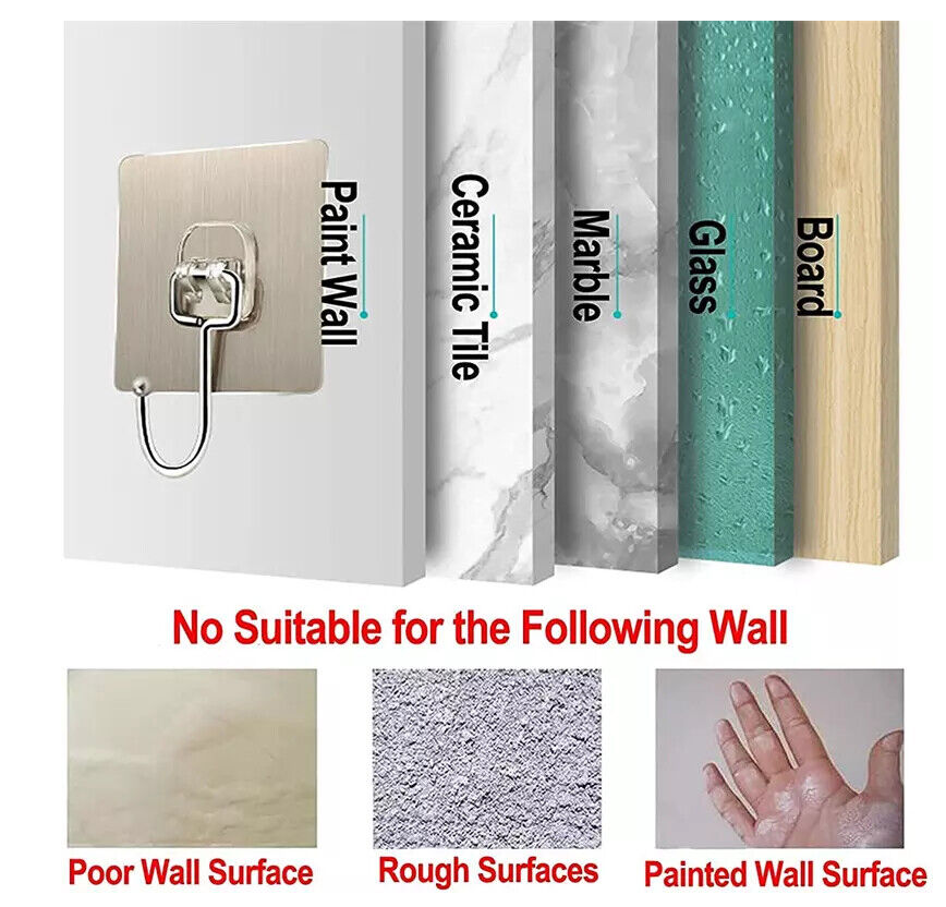 • ?Widely Application?: Large adhesive hooks can be widely used on a variety of surfaces, like smooth tile, glass, mirror, wood, metal surface and so on((Painted walls, wallpaper surfaces and rough surfaces not advised).