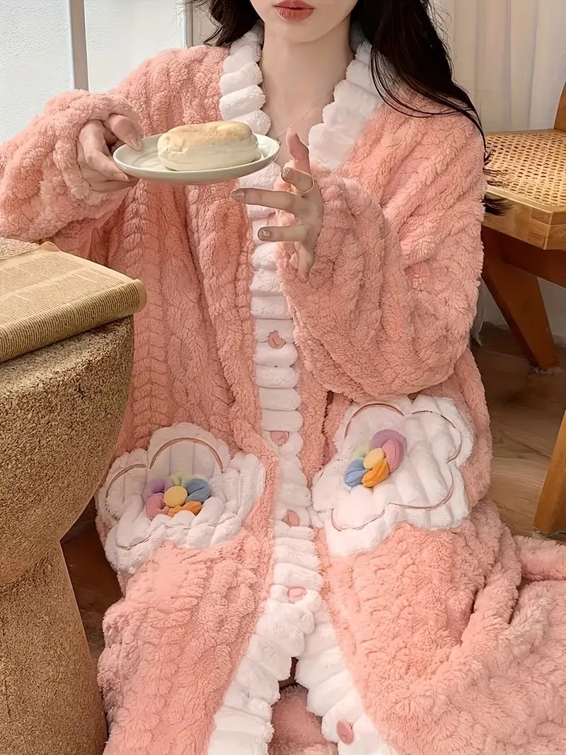 flower decor fuzzy night robe cute long sleeve v neck robe with pockets womens sleepwear details 6flower decor fuzzy night robe cute long sleeve v neck robe with pockets womens sleepwear details 6