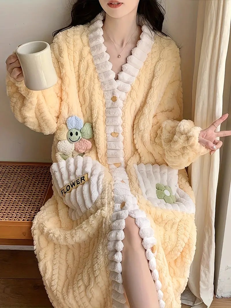 flower decor fuzzy night robe cute long sleeve v neck robe with pockets womens sleepwear details 1flower decor fuzzy night robe cute long sleeve v neck robe with pockets womens sleepwear details 1