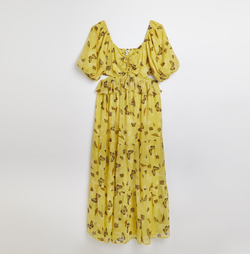 River Island Womens Maxi Dress Yellow Print Cut Out Stylish Short Sleeves