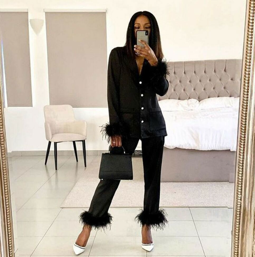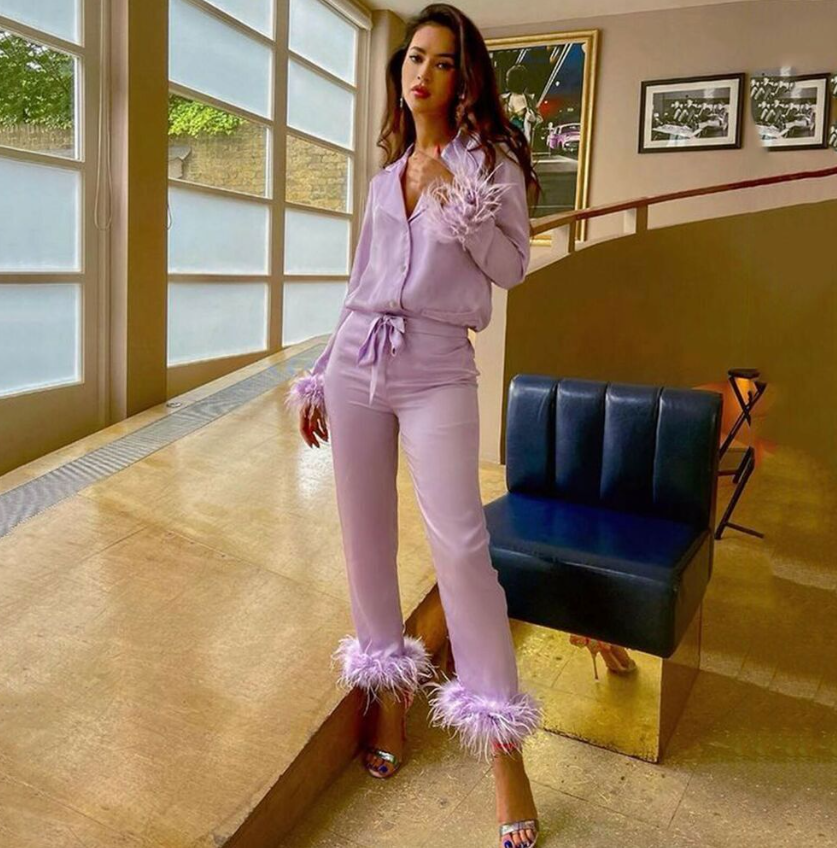 Women Feather Silk Long Sleeve Top+Pant 2 Piece Pajamas Set Sleepwear Nightwear